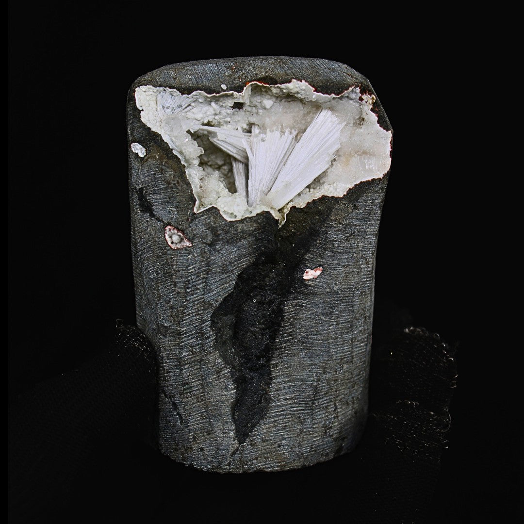 This natural Scolecite spray on Quartz geode (330g) showcases delicate white sprays beautifully contrasting against a Quartz matrix. Directly sourced from Maharashtra, India, this rare Zeolite mineral specimen is prized by collectors and healers alike. ✨