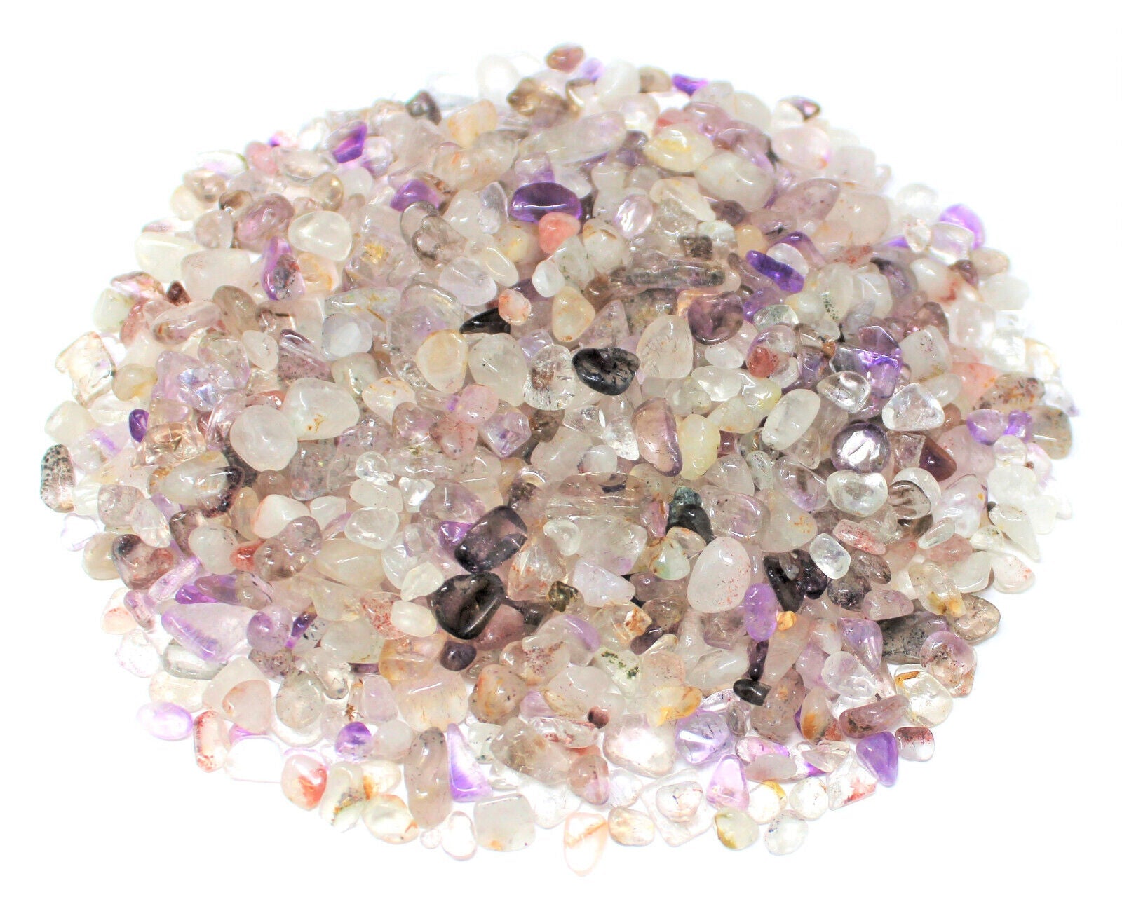 Choose your Semi Tumbled Gemstone Chips from the drop down menus. Each selection has 5 size options of your desired crystal; 2 oz (1/8 lb), 4 oz (1/4 lb), 8 oz (1/2 lb), 1 lb and 2 lb. Assorted mixed irregular sizes in the range of about 5 - 15 mm.